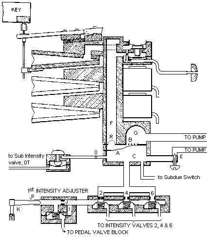 With 2, 4 and 6 and 0 open, the suction maintained in chamber C produces an intensity which is lower than the No. 1 intensity. This is called the "sub" intensity and is used to obtain extreme pianissimo effects.