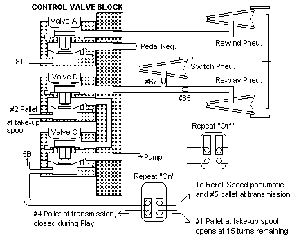 Referring to Fig. 27, it will be seen that valve D which controls the switch pneumatic, and also the repeat pneumatic, only has suction supplied to it from valve C during reroll when the repeat switch is set at "On" or when the 5B hole in the tracker bar is open.