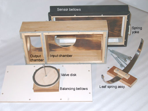 The top board is glued to the box frame toward the big sensor bellows. This cover has the circular valve seat and a big hole to let flow toward the output. The box bottom is a flat board where the balancing bellows is centrally mounted with a screw. The assembly is held together by eight long screws gripping Teenuts inserted into the frame of the sensor bellows, make for easy disassembly.