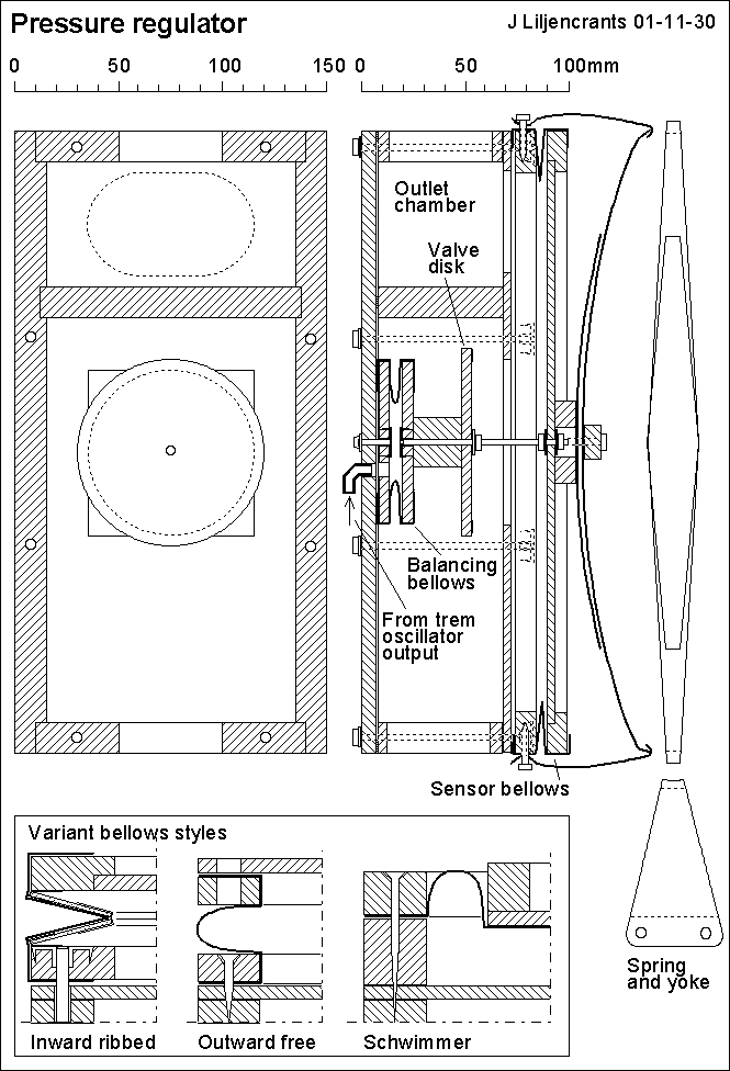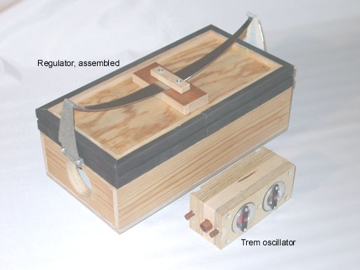 Here is a design for a small simple pressure regulator as I have finalized it after several pilot attempts, initiated by Zeb Vance who taught me about his Aeolian regulator. For my organ I have built four of these, one for each wind chest. A specific feature in this regulator type is a small balancing bellows, the interior of which is normally connected to atmosphere. A second use for this little bellows comes when you feed it with an externally supplied control pressure that will then modify the regulator output pressure. When this control is a pulse train of suitable frequency the regulator will operate as a tremulant. A particular merit of this principle, distinguishing it from conventional trems, is that it avoids power consumptive and noisy periodic air dumps. Instead the output pressure is actively controlled to pulsate. An oscillator to generate such a control signal, made from two pouch operated valves arranged into a feedback circuit is also described. This oscillator is believed to be an innovation in the art of organ building.