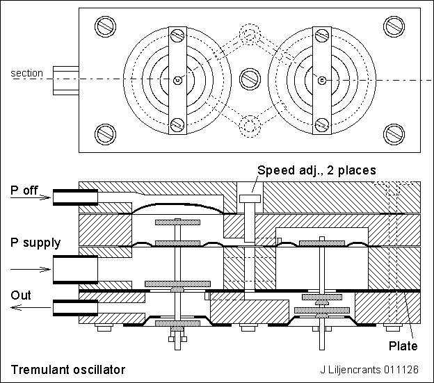 For an oscillator you basically need an inverting valve feeding back its output to its input. To control the speed you also need a delay element. And to render a reliable start, some kind of hysteresis, otherwise the device may stay in some intermediate half open position. This is often implemented with a sliding valve element with backlash.The present primary invention is to make an inverting outside valve with its two seats unequal diameters, the left one in this drawing.